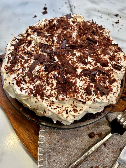 - Top the chilled pie with the fresh whipped cream and sprinkle with shaved chocolate and serve.